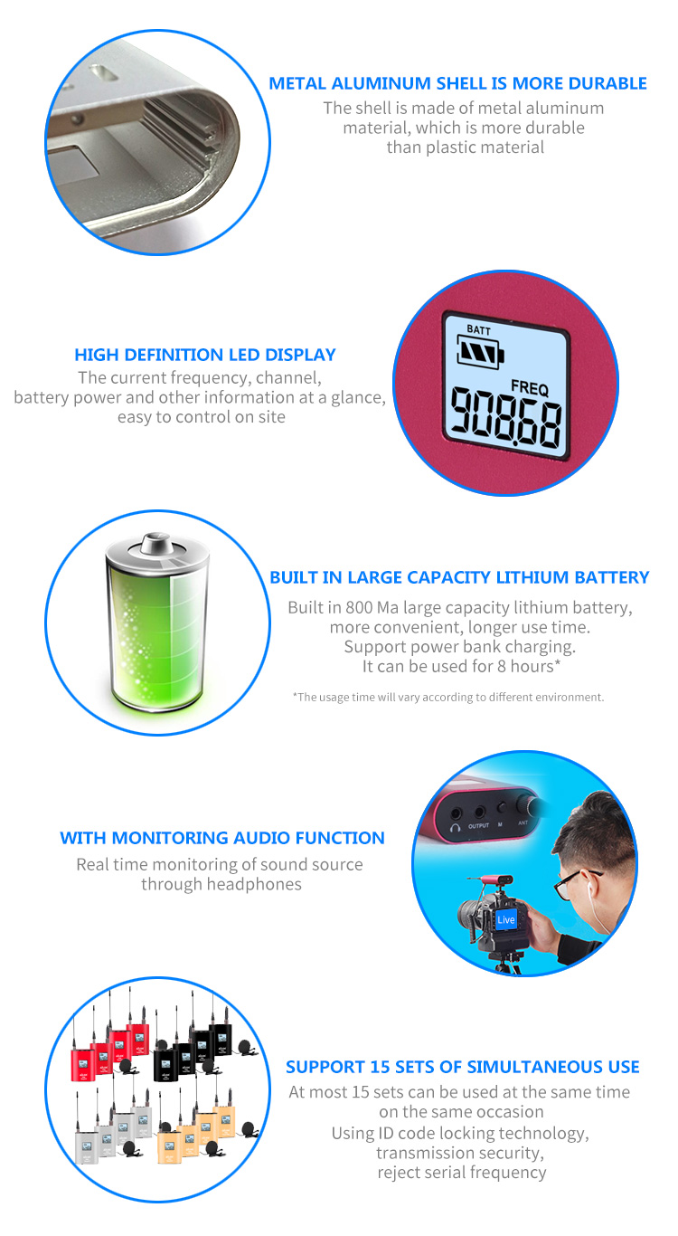 MV6 Mini Wireless lavalier Microphone is the latest product developed by our factory. It can be widely used in TV interview, video shooting, live network, musical instrument performance and other occasions with SLR digital camera, camera, mobile phone, musical instrument, etc. its appearance design is simple, small and easy to use. It adopts UHF Wireless connection technology and the use distance is up to 60 meters. It is a national utility model patent and appearance design Patent products.